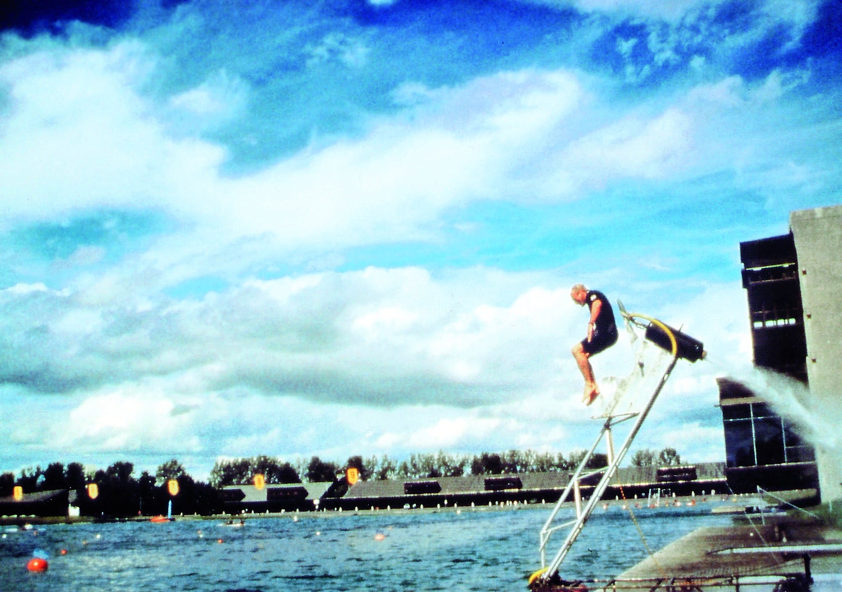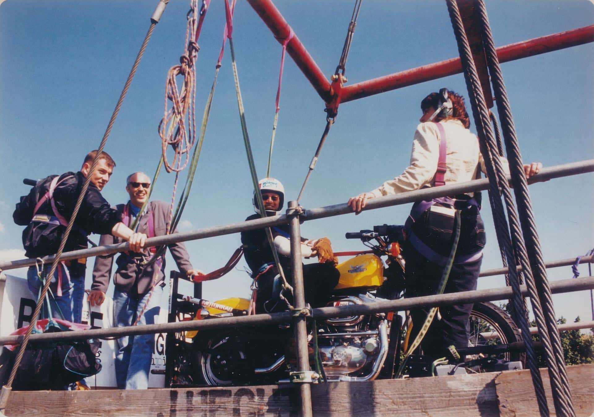 Immer wieder etwas Neues: Im Juni 1994 springt Jochen Schweizer beim Harley-Davidson Summer Festival mit einer gelben Harley-Davidson von einer Plattform aus 50 Metern. Der von Harley-Davidson gebuchte Stunt war die nicht-musikalische Attraktion des Festivals, bei dem Deep Purple als Haupt-Act gebucht war.