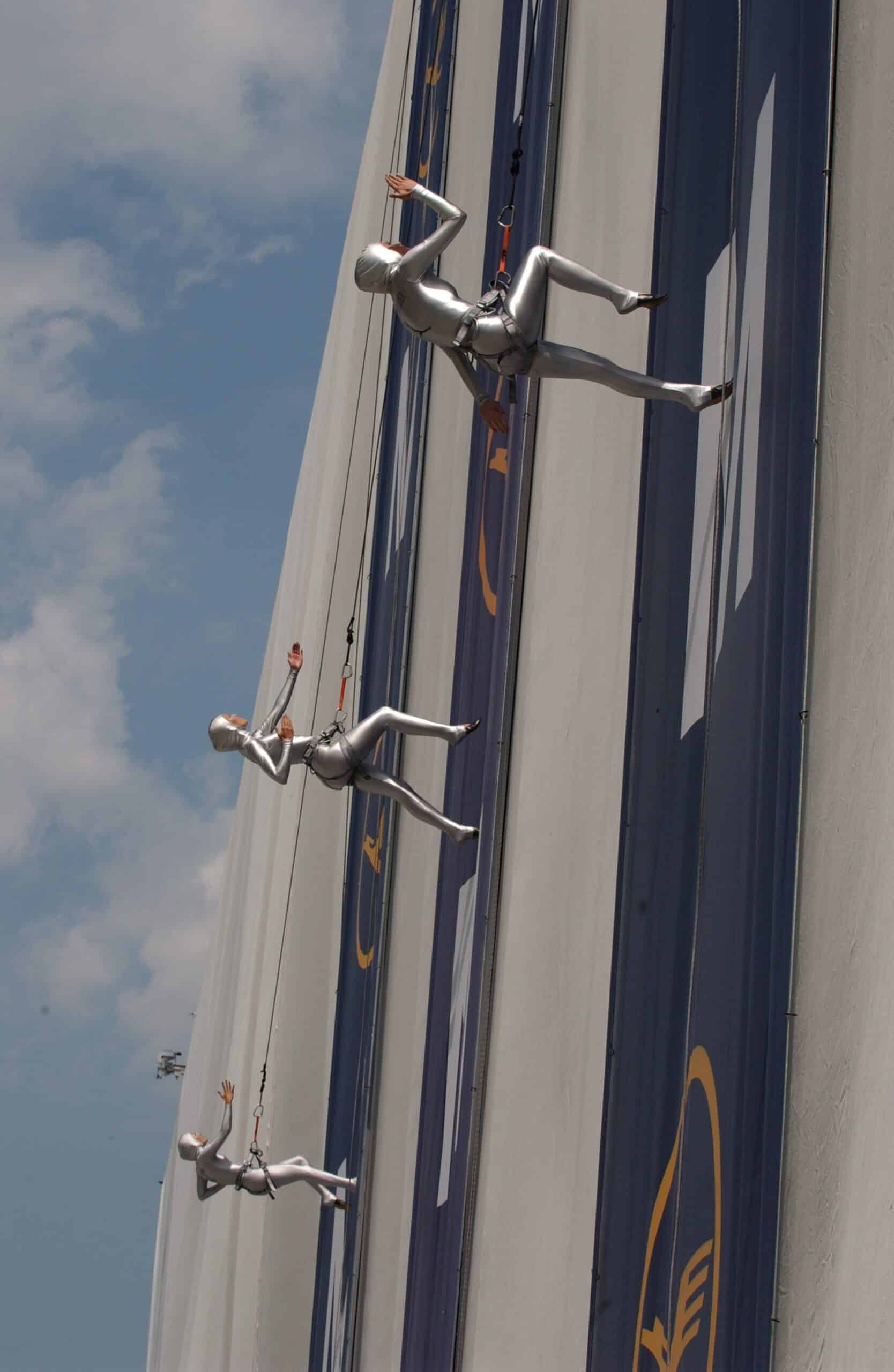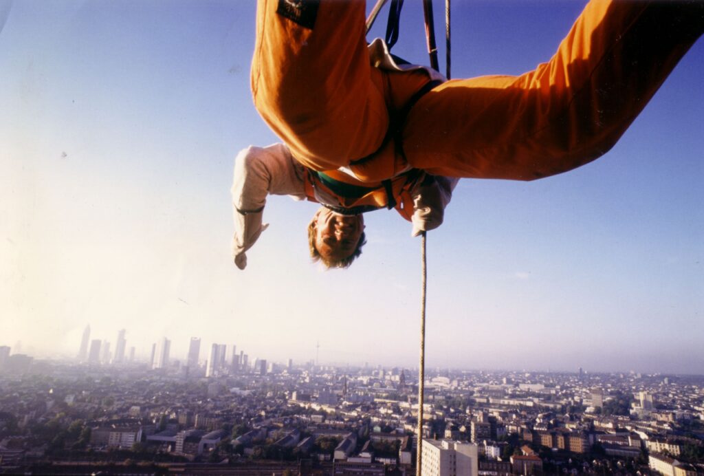 Noch heute laufen jedes Jahr über 10.000 Menschen mit Jochen Schweizer Hauswände herab. In Frankfurt zwar nicht mehr am Henninger Turm, dafür aber an der längsten House-Running-Fassade in Deutschland. 100 Meter geht es am Leonardo Royal Hotel steil nach unten.