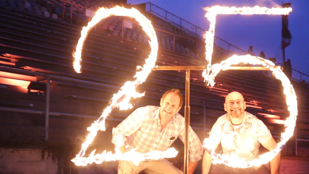 Am 1. Mai 1990 ging die erste stationäre Bungee-Anlage von Jochen Schweizer an der Ruderregattastrecke in Oberschleißheim bei München in Betrieb. 25 Jahre später, am 1. Mai 2015, sollte die 25 Jahresfeier steigen. Aufgrund sehr schlechter Wetterverhältnisse wurde sie dann kurzfristig auf den 6. Juni verlegt. Es lohnte sich: Bei strahlendem Sonnenschein und über 30 Grad feierten die Mitarbeiter, Freunde und Partner des Unternehmens gemeinsam. Zum Programm gehörten ein Drachenbootrennen, Yoga mit Patrick Broome und natürlich Bungee-Springen.
