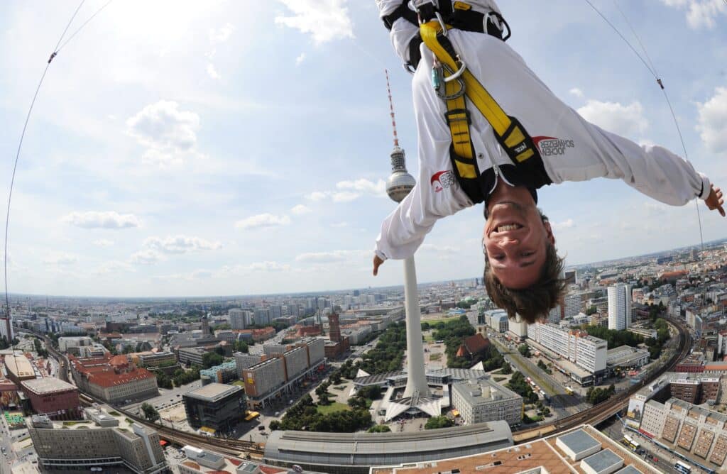 Wie fühlt es sich an, mit nahezu Freifallgeschwindigkeit in Richtung Alexanderplatz zu rauschen und kurz vor der Landung sachte abgebremst und wohlbehalten mit beiden Beinen auf dem Boden zu landen? Das können Jochen Schweizer Kunden seit dem 14. Mai 2009 am Park Inn Alexander Platz in Berlin erleben. Mit Base Flying schuf Jochen Schweizer ein in Europa einzigartiges Erlebnis mit Adrenalinrausch-Garantie.