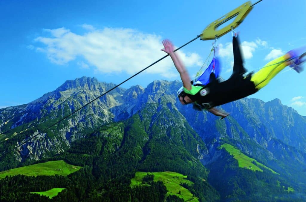 Auf 1,6 Kilometern schweben die Stahlseilflieger wie Superman in bis zu 140 Metern Höhe über die Berge. Maximalgeschwindigkeit: sportliche 130 km/h! Ein Flug mit dem Flying Fox XXL ist Adrenalin pur, ein unvergessliches Erlebnis. Der Flying Fox XXL ist eine Kooperation der Jochen Schweizer Unternehmensgruppe mit den Leoganger Bergbahnen.