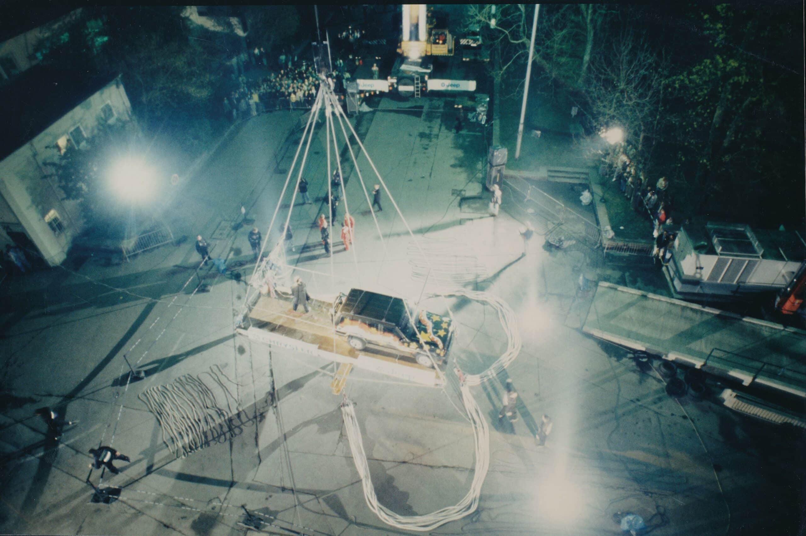 1997 wird Jochen Schweizer als Highlight für die Mitarbeiter- und Vertriebsveranstaltung von Chrysler gebucht. Das Event am alten Münchner Messegelände sollte mit einem spektakulären Erlebnis unvergesslich werden. Dies gelingt mit einem Auto-Bungee-Stunt, bei dem ein Jeep Cherokee von einer 50 Meter hohen Plattform von Jochen Schweizer persönlich heruntergefahren wurde. Neben Jochen saß der damalige Chrysler-Vorstand und auf dem Rücksitz ein Freiwilliger aus dem Publikum.