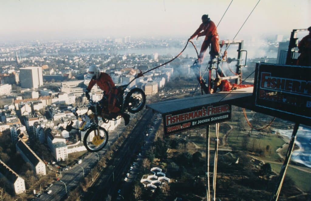 Jochen Schweizer setzt den Produkt-Slogan von Fisherman's Friend auf ungewöhnliche Weise in Szene. Am 15. Januar 1997 fährt er als erster Mensch überhaupt mit einem Motorrad vom 130 Meter hohen Hamburger Fernsehturm, gesichert durch ein Bungee-Seil. Weltrekord!