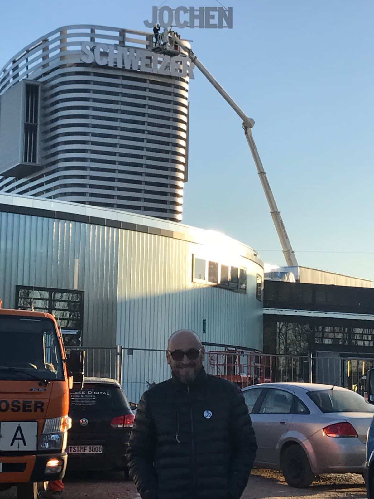 Gemeinsam mit über 200 Mitarbeitern und ausgewählten Pressevertretern zelebrierte Jochen Schweizer am 8.12.2016 die Fertigstellung der Fassade und das Einschalten des beleuchteten Jochen Schweizer Schriftzugs am 30 Meter hohen Turm der Jochen Schweizer Arena.